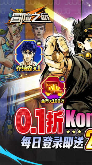 《点击冒险之旅》是一款自由度极高的即时操作策略卡牌游戏。生动经典的剧情,丰富多样的玩法,精美还原的立绘,飒爽酷炫的特效。波纹气功,吸血鬼,柱之男。飙马野郎、格斗场、试炼中体验酣畅淋漓的战斗,将会给Jo厨们带来最原汁原味的黄金体验。全作原版角色任你搭配,一起向未来传承希望,面对这血之记忆,组建最强战队,放肆的施展拳脚吧!