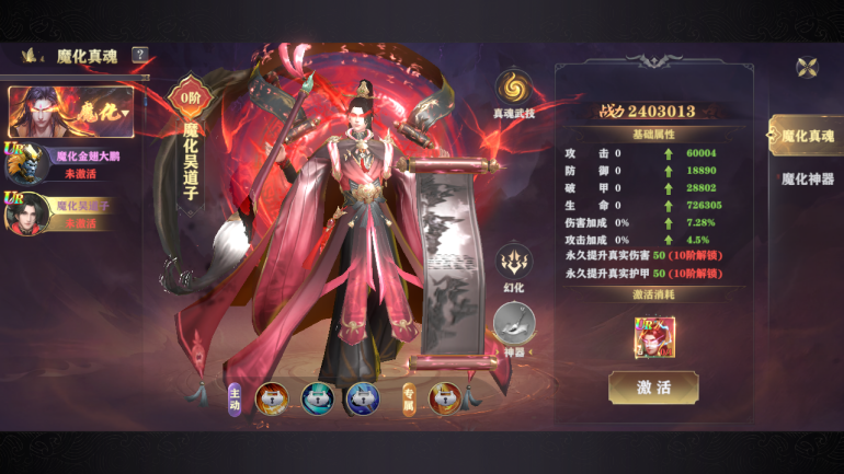 前期除了装备、还有各个进阶线的需要养成外,核心战力在法相;法相是必搞的