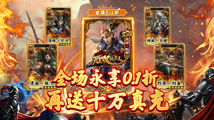 充值比例1元:1000元宝 ★上线福利:送VIP、神将,高连抽! ★0.1折三国卡牌手游,全档位充值永久0.1折! ★登录直升VIP20,享受最顶级的游戏体验! ★登录即得强力武将赵云,搭配每日高连抽,开局所向披靡! ★升级即送十万现金卡,资源永不枯竭! ★超值礼包低至1分钱,极品武将、稀有资源助力快速成长! ★后缀说明:0.1折轻策略三国手游!