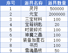 单日真实充值每满1000元,可任选以下表格中一份奖励道具(九选一)。