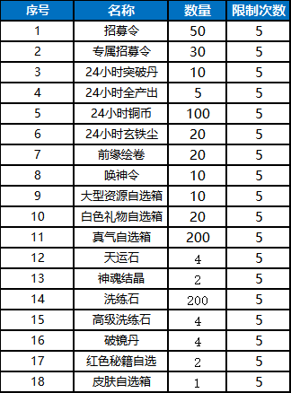 额外福利3:单日充值满6000元(实付),可选择25种方案,额外赠送顶级元系侠客自选箱Ⅱ*10