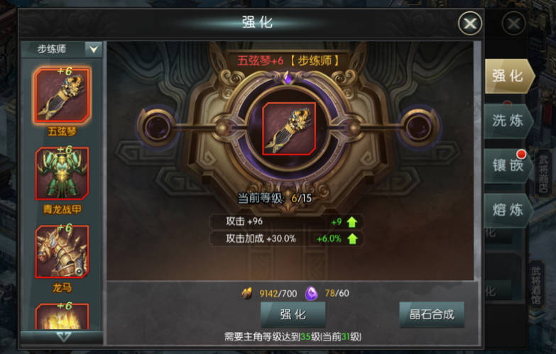 装备强化到+2、+4、+6、+8时,可以分别开启一个宝石镶嵌孔,镶嵌宝石可以大大增强武将的属性。
