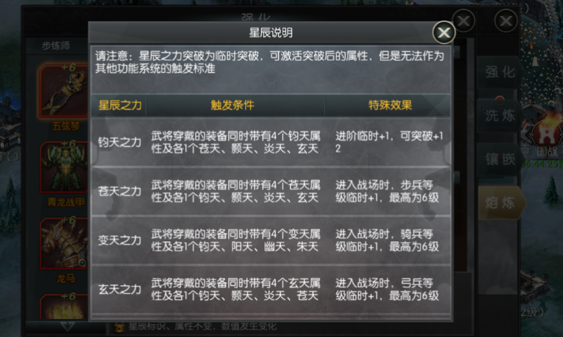 当武将装备上触发条件的拥有星辰之力的装备套装时,就可以获得特殊效果,不同的触发条件拥有不同的特殊效果。