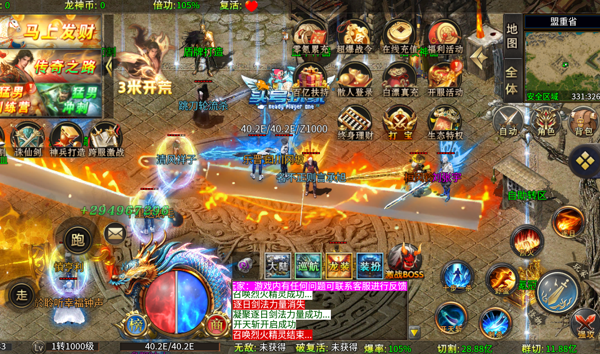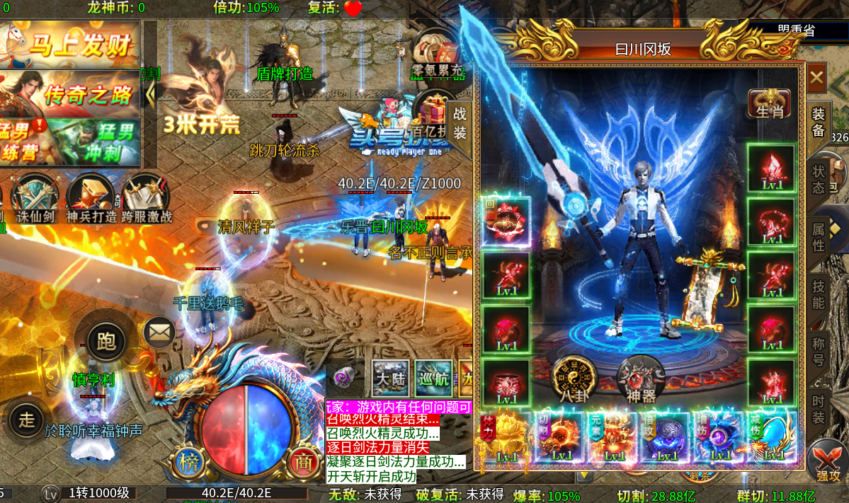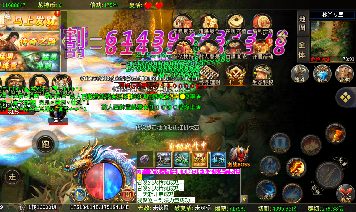充值比例1元:1充值积分 ★【开局豪礼】自动拾取、自动回收、特殊装备 ★【马上发财】满足杀怪数量领取大量货币 ★【散人登录】大量货币、属性登录即领,送足七天 ★【还有更多】每日在线、等级挑战、大陆通关、每日除魔... ★【后缀说明】刀刀飘血爆爽群切飞剑超变