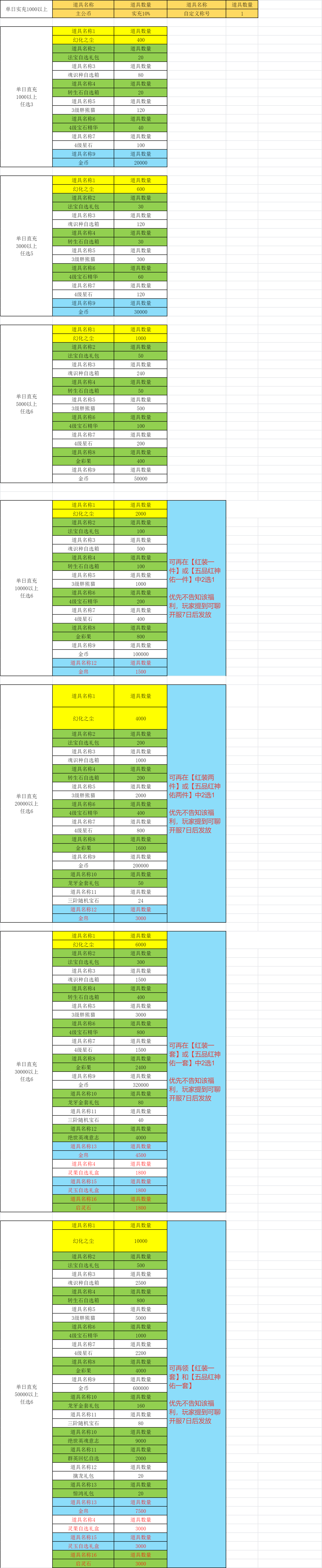 3.表格内为可赠送上限,提供玩家时尽量5折至8折提供,以留玩家争取空间