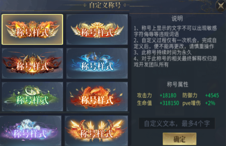 ④称号名称限制4个字内,不得含有特殊符号,定制名称不得涉及黄赌毒、辱骂等违法不良文明信