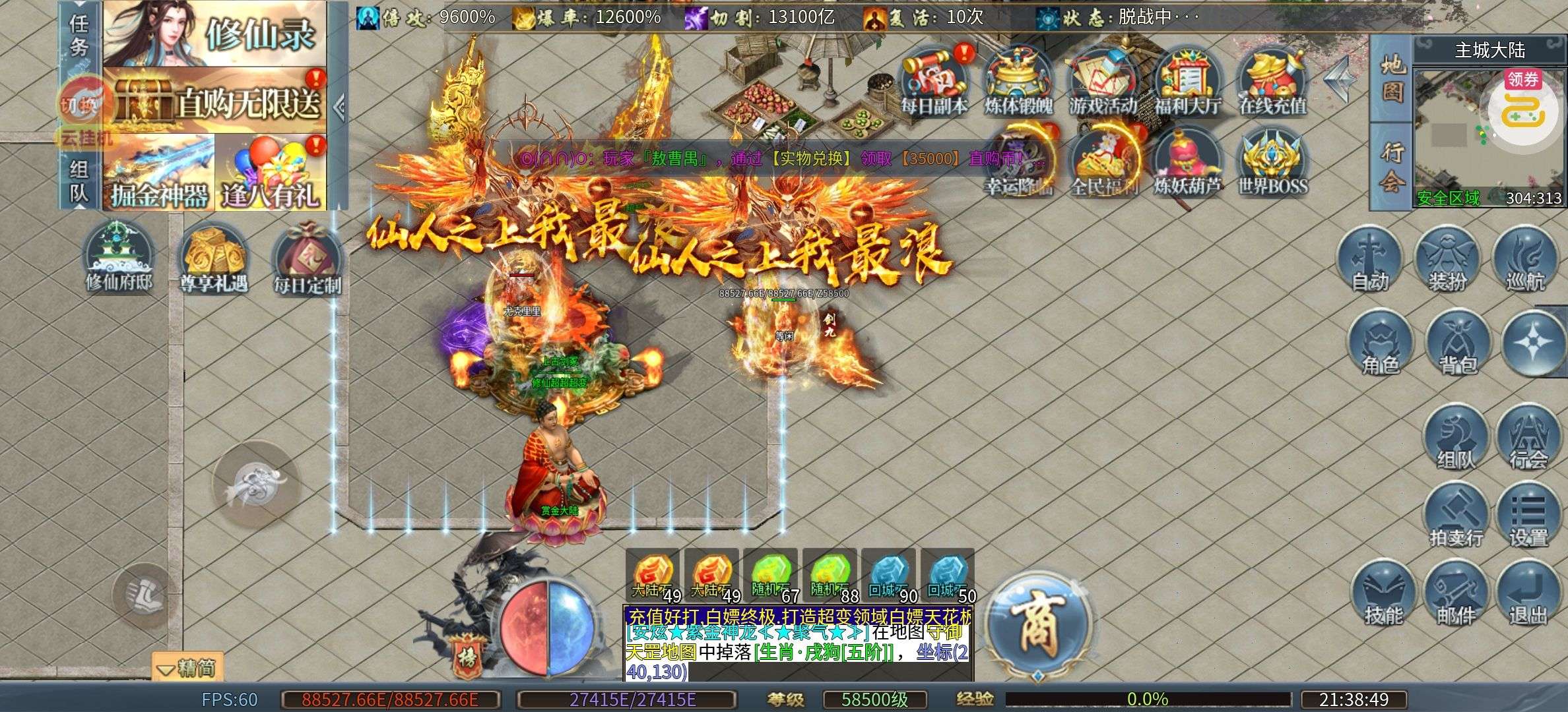 充值比例1元:1账户余额 ★自动拾取、自动回收、十亿切割 ★刷怪获取抽奖次数,无上限抽取直购币 ★签到奖励、在线奖励、等级奖励、杀怪奖励 ★超变单职,简单粗暴爽就完事 ★福利多多,助力开荒体验无压 ★后缀说明:修仙元素融合超变单职业版本