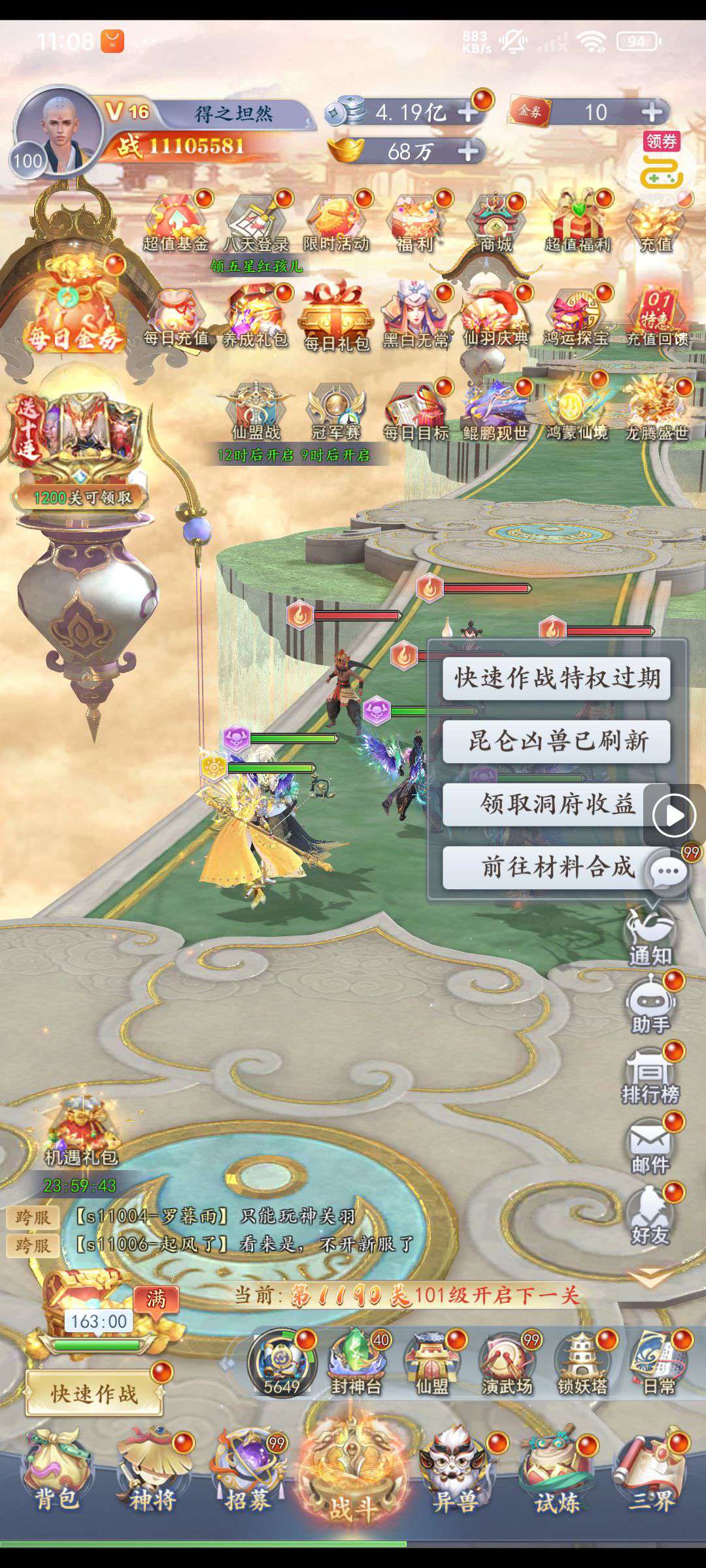 充值比例1元:10游戏货币 ★开局福利大礼包:7阶仙羽(自选)*1、封神令*5、神级红色卦灵(自选)*1 ★超强开局:超*极速大礼包可获得主角经验值(5级升到30级),六耳猕猴碎片*50 ★免费千抽福利强势来袭,疯狂连抽超强英雄 ★极速养成,升级助力,礼包兑换助力升级,过关领千抽好礼