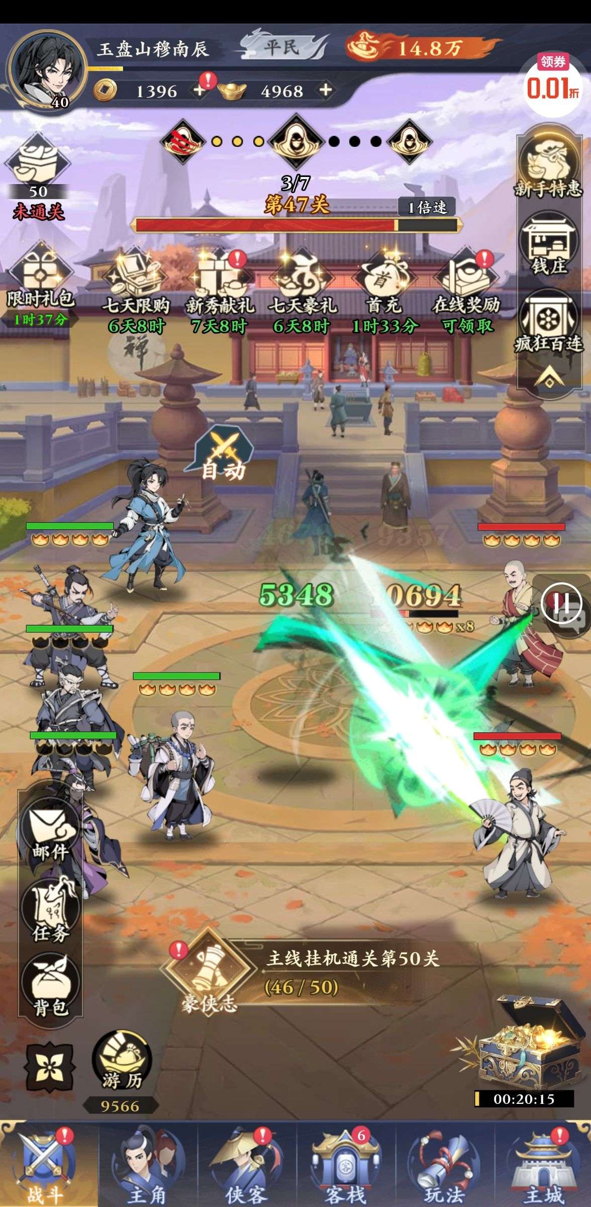 進遊,可以跳過新手,先去客棧的酒坊裡使用酒,能得到一隻sr角色,用他打幾關,開江湖開打江湖,剛進遊可以去兌換禮包碼,裡面有灌煲湯(關卡自動),然後用兌換碼的招募卷,招募10次,會送幾隻ssr,把這些裝上裝備再升50級,打幾關江湖,很快就能40級,記得要去主角那裡升哦!*沒有平台648代金,遊戲似乎也沒有內置代金可以購買*物價不算貴,但禮包有點多*完成任務能升vip*江湖要跳過要400級或完成首充*如果開加速,遊戲一直顯示因加速異常,不用理會,如果覺得煩,也能選擇不開(完成任務時間可能會較慢)*約半小時內能完成